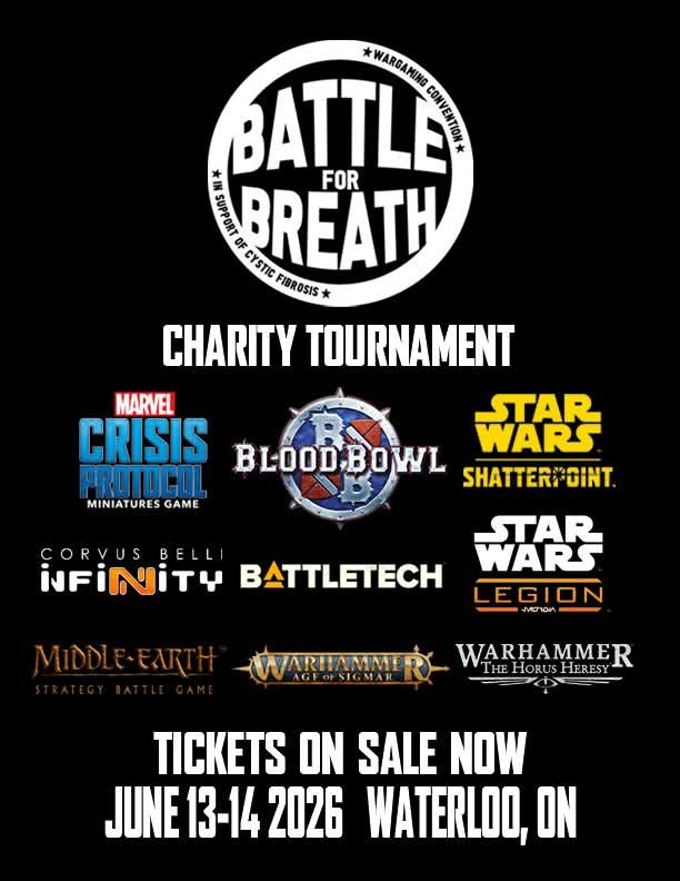 June 13th – 14th, 2026 at the KW Granite Club, 99 Seagram Dr, Waterloo, ON a wargaming tournament to raise funds for Cystic Fibrosis Canada. Registration The Battle for Breath is free to attend. Come visit our vendors, buy some raffle tickets, and enjoy a drink. Individual tournaments have a fee to participate, details can … Continue reading Battle for Breath 2026